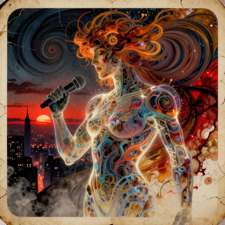 Medieval romanticism neon glowing contoured filigree detailed transparent character layered rough textured comic syle, artistic robotic body, podcast microphone in hand, masterpiece portrait cinematic magic art nouveau collage by Mucha flat perspective, high contrast, dynamic intricated pose made of swirling colors on cracked scars and wounds close up dynamic color blood on the face abstract expressionism alcohol ink drawing double exposure swirling spiral diptych two parts in one art landscape ink cinematic portrait on cracked old antique burned paper, transparent earth panorama poster ultra detailed complex print transparent illustration detailed perfect face city lights, city panorama red sunset dynamic movement Craola Kuindzhi Dan Mumford Andy Kehoe expressive brushstrokes mixed with wash masterpiece, transparence intricated lighting, dynamic shadow play sparks, high deepness cinematic foggy