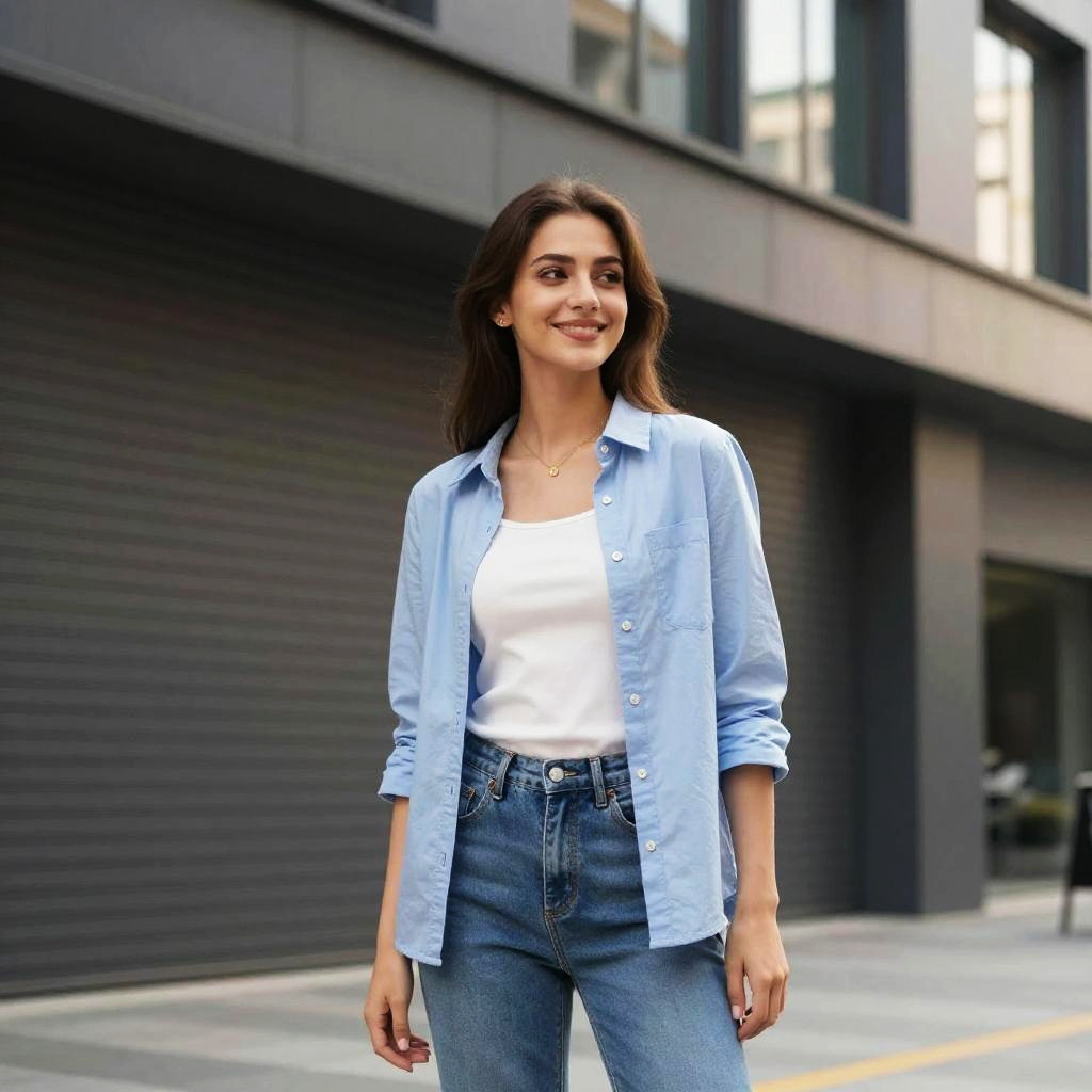 A young woman with long wavy hair wearing a pale yellow blouse and stone-beige tailored shorts, standing against a granite wall in bright natural urban light, casual modern style, photorealistic, blue denim color scheme with beige stone background