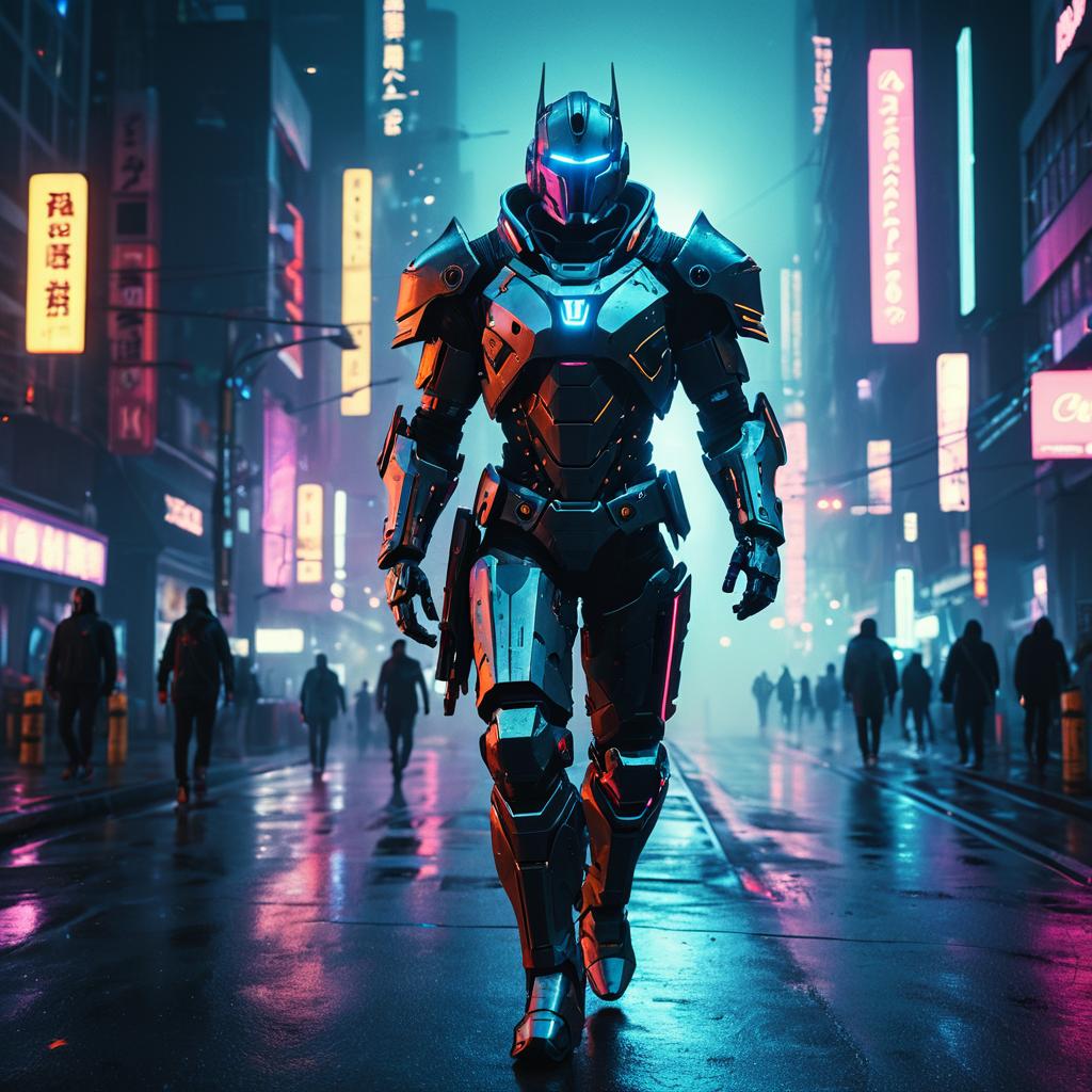 Futuristic Cyborg Knight in Neon Cyberpunk City