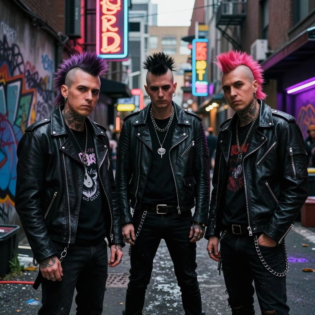 Punk themes dominate a rebellious urban street scene with graffiti walls, mohawks, leather jackets, chains, vibrant neon lights, and a gritty dystopian atmosphere, cinematic style