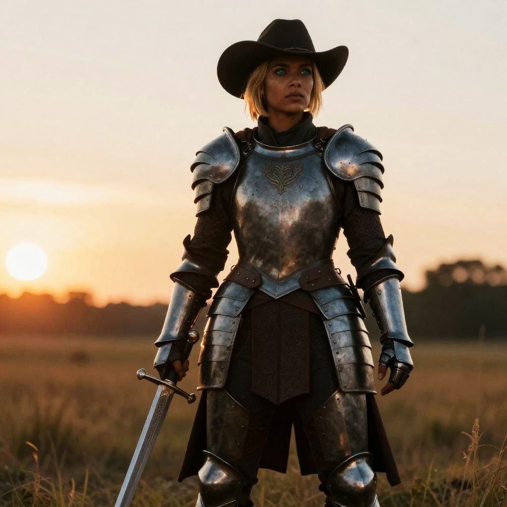 Dark-skinned mature woman with short blonde hair and aqua eyes stands in a field at sunset. She is wearing full medieval-style metal armor including armored pants, gauntlets, a tabard, and a cape. She holds a sword in one hand and wears a dark cowboy hat, blending elements of medieval and western styles in a cinematic outdoor setting.