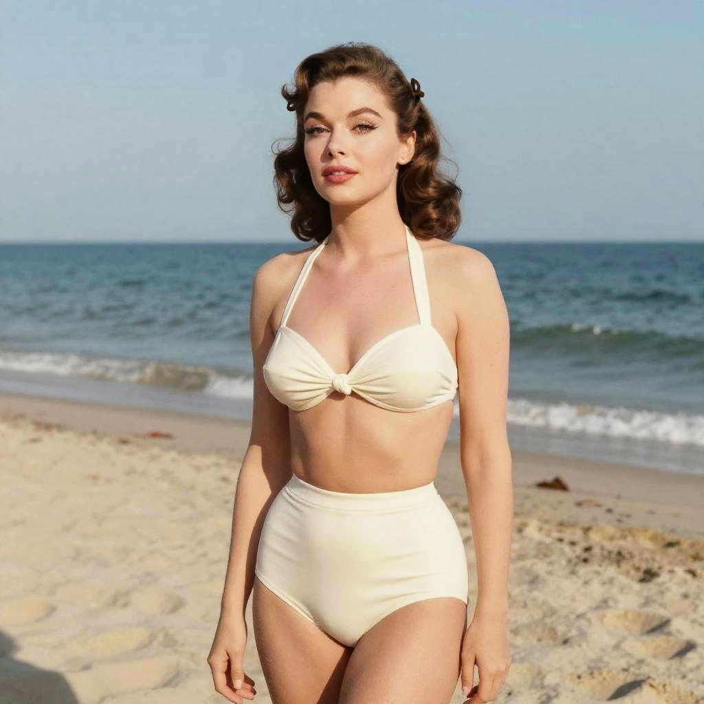 Lauren Bacall bikini fashion shoot, old Hollywood elegance meets modern beachwear, sunlit boardwalk, subtle sepia tones, sophisticated and poised