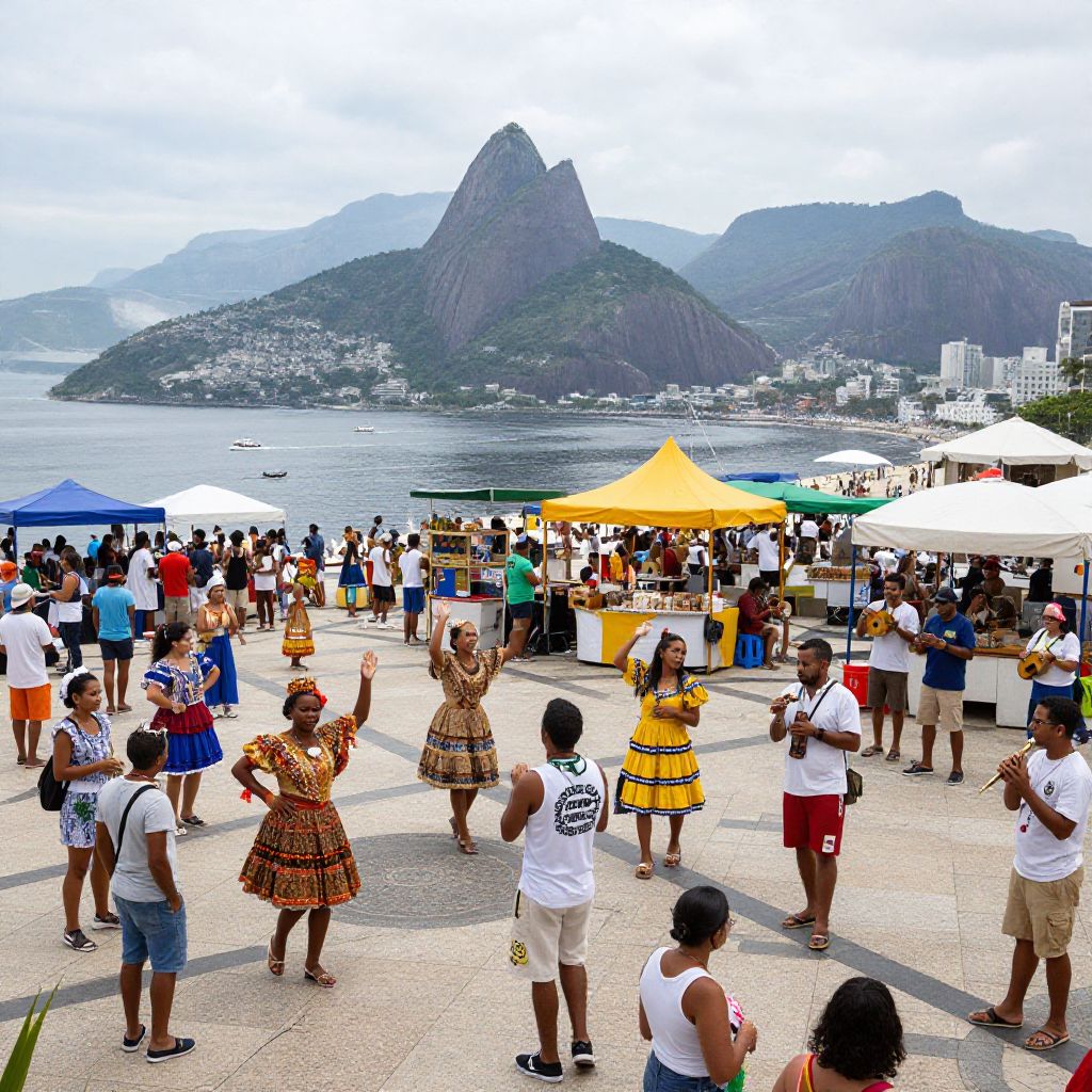 A bustling outdoor plaza in Rio de Janeiro, Brazil, where locals and tourists gather for a festival, featuring dancers in traditional costumes, food vendors, and musicians playing diverse musical instruments