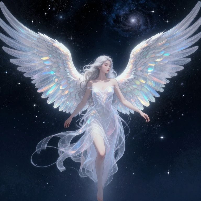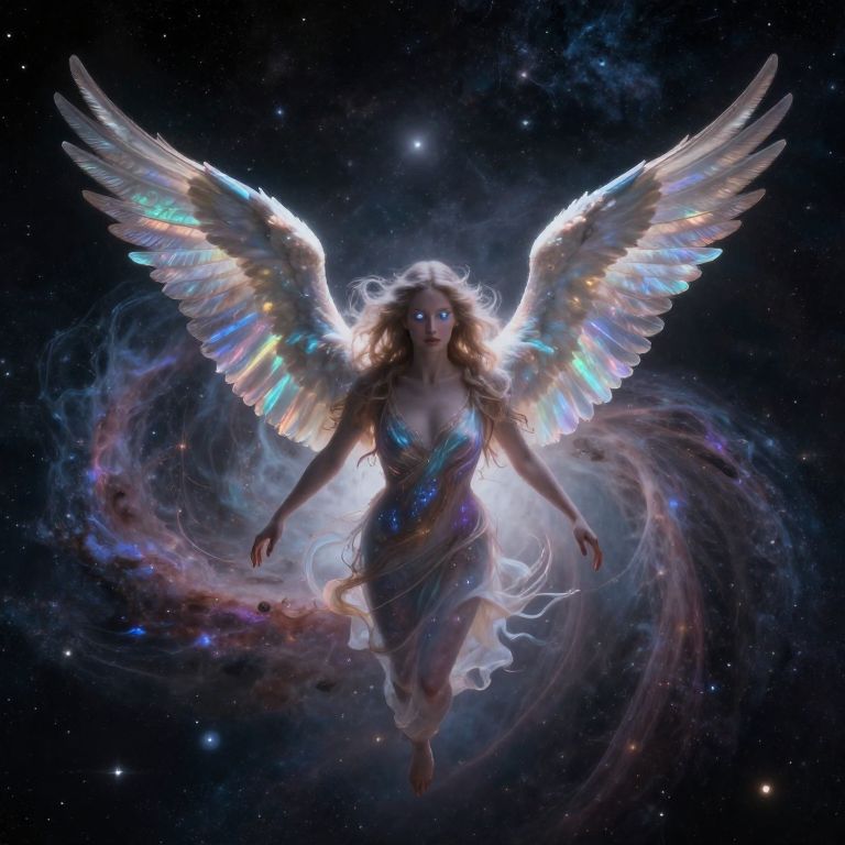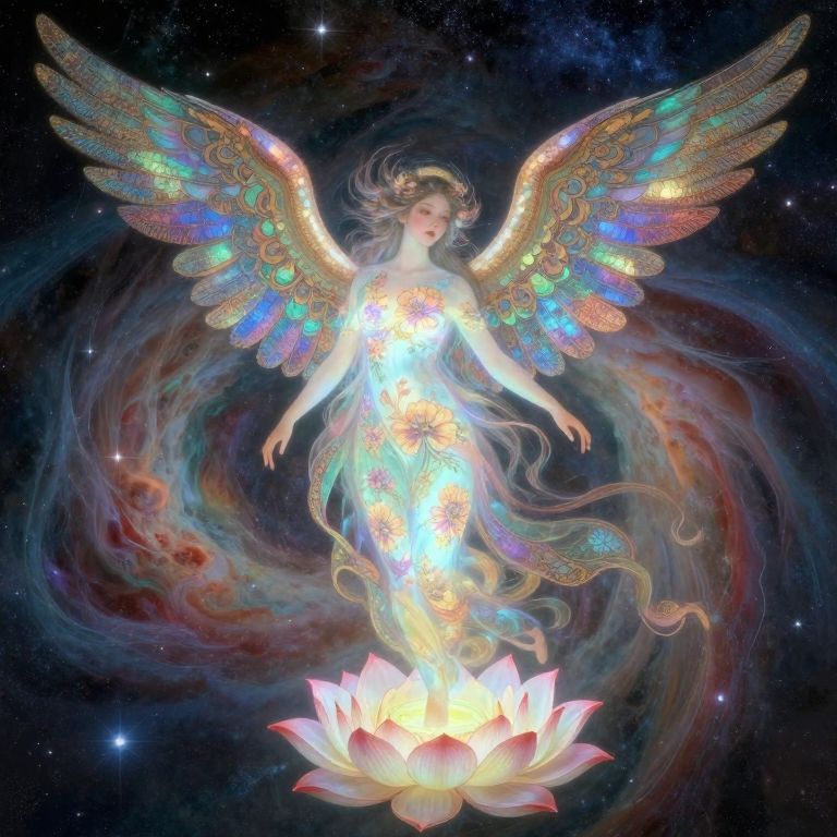 Digital illustration of a glowing, ethereal angel with rainbow wings standing in a vibrant, starlit flower garden at night.