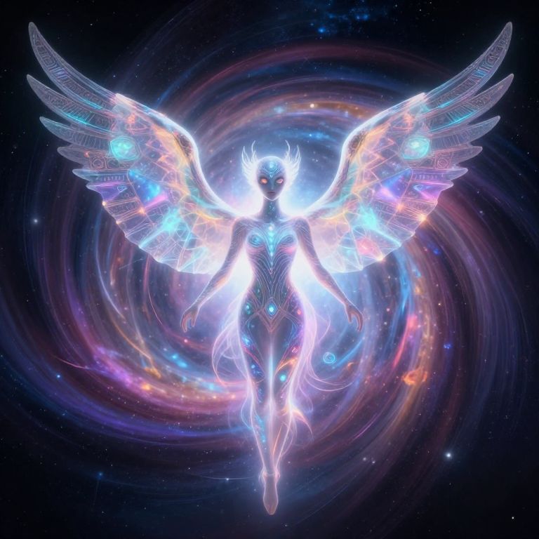 An ethereal celestial being with iridescent wings spread wide in a cosmic garden is depicted in this digital art illustration. The creature's translucent skin softly glows, illuminating the vibrant flowers and luminescent vines it rests upon from an aerial viewpoint looking down on this surreal landscape where celestial bodies and organic elements intertwine, evoking both wonder and tranquility.