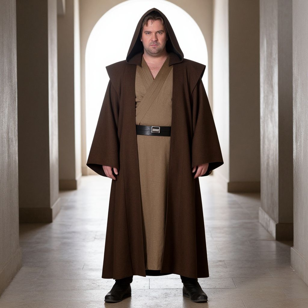 Jedi Costume Plus Size, man in a robe and a hood standing in a hallway