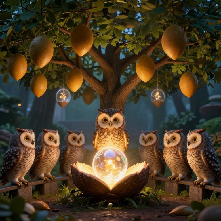 Owls Debating Beneath Glowing Seedpod Tree