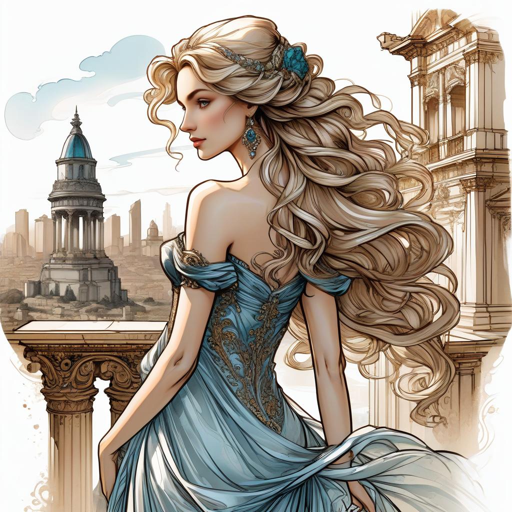 Ink Permanence french rococo art style by J. Scott Campbell detailed illustration Helen of Troy with long flowing hair and silk gown upper body ancient city skyline transparent background png