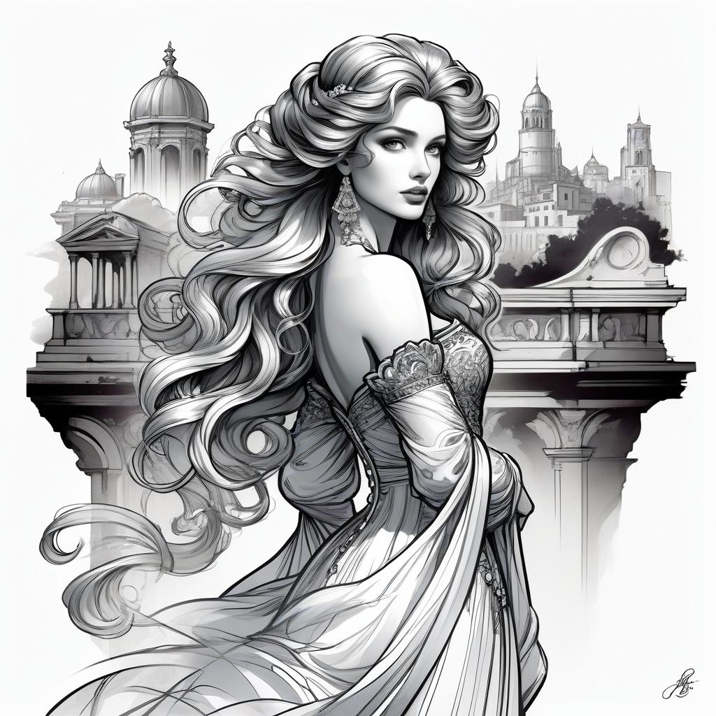 Black and white detailed illustration in French Rococo style depicting a woman reminiscent of Helen of Troy. She has long flowing hair adorned with a floral headpiece and wears an ornate silk gown with lace and corseted bodice. The upper body portrait includes a background of an ancient city skyline featuring classical architecture and domed buildings, rendered with fine ink permanence technique.