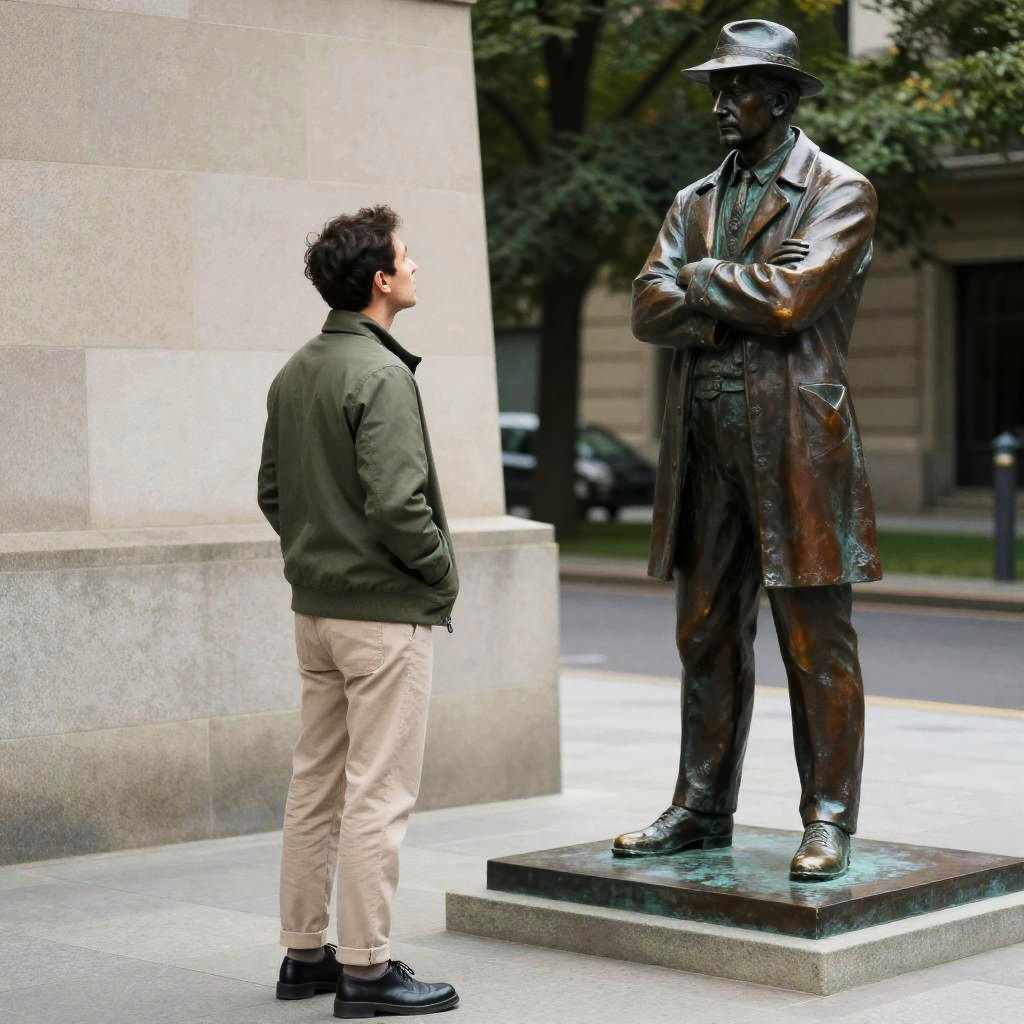 A man wearing a green jacket, beige pants, and black shoes stands on a city sidewalk looking up at a life-sized bronze statue of a man dressed in a brown coat, hat, tie, and formal attire. The statue stands on a stone platform with arms crossed. The scene is set outdoors near a stone wall with green trees and urban elements in the background during daylight.