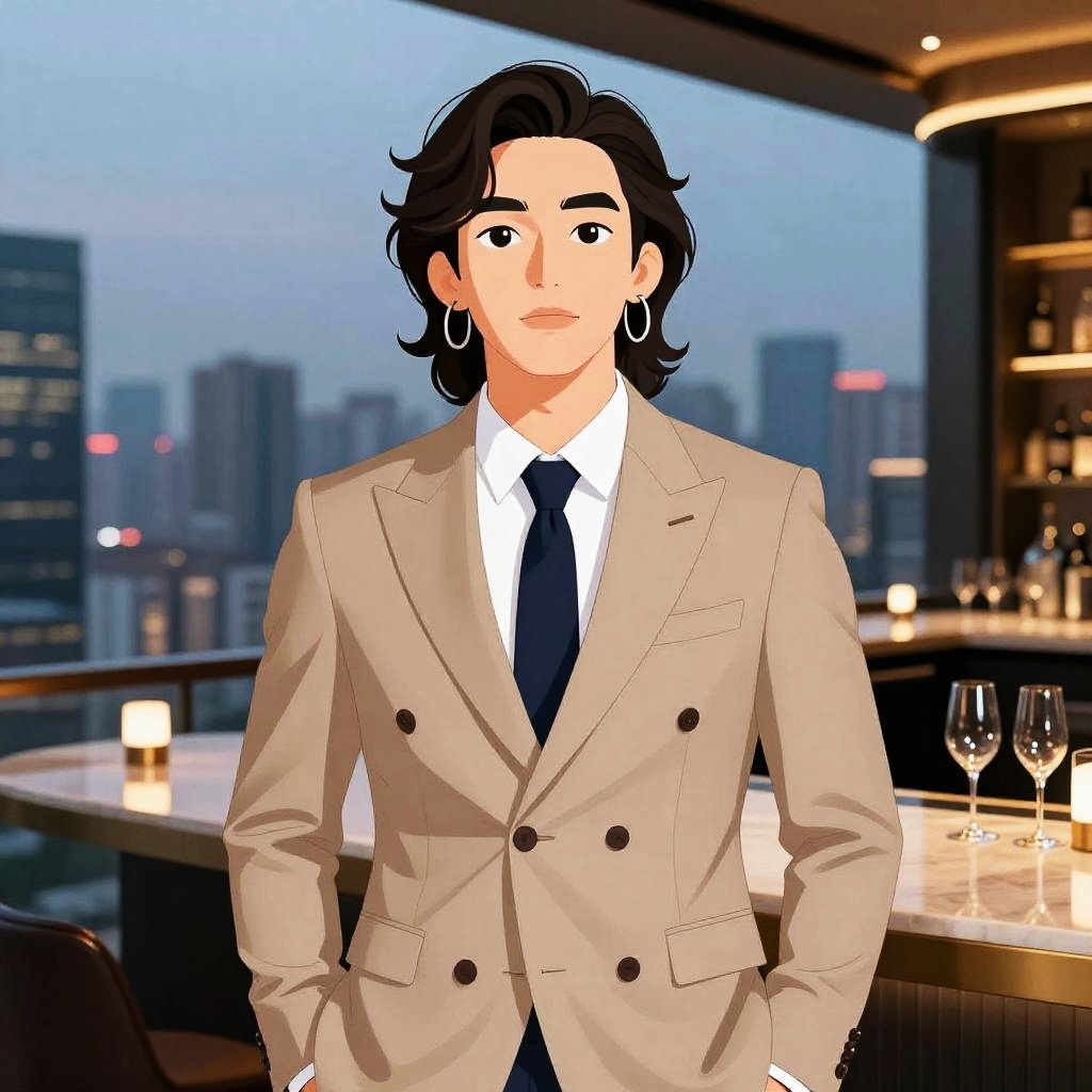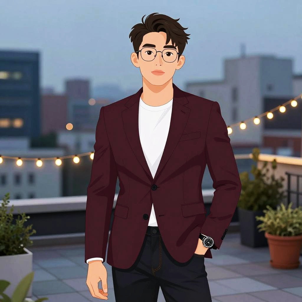 Stylish young man with glasses, fitted maroon blazer over a white T-shirt and dark slim-fit jeans, urban rooftop garden with twinkling fairy lights at twilight; contemporary glam, statement black leather watch, short tousled hair, confident fashion pose, photorealistic, high-fashion editorial feel, glossy skin highlights, tasteful makeup, clean minimal styling, shallow depth of field, rim-lit edges, soft shadows, cinematic color grade, crisp fabric texture, balanced composition, subtle lens flare, studio polish, sharp focus. --sref 1467