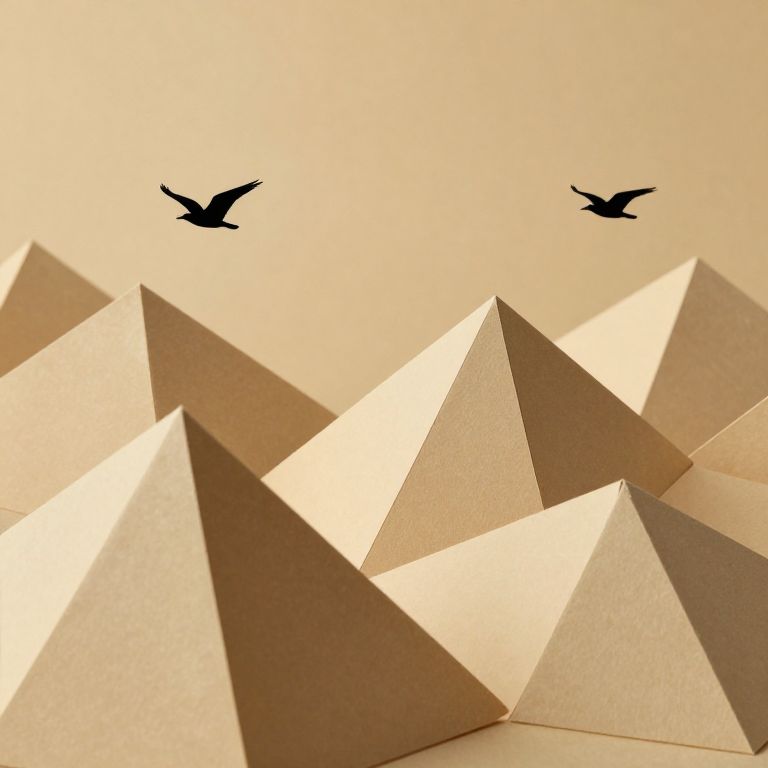 Photograph of a minimalist, abstract scene featuring multiple large, beige, paper-like triangles in the foreground, creating a geometric pattern. Two black silhouettes of birds are flying in the upper background against a soft, beige sky. The triangles cast sharp, angular shadows, adding depth and contrast to the image. The overall composition is clean and modern, emphasizing simplicity and contrast between the geometric shapes and the natural flight of the birds. The image evokes a sense of calm and balance between man-made structures and nature.