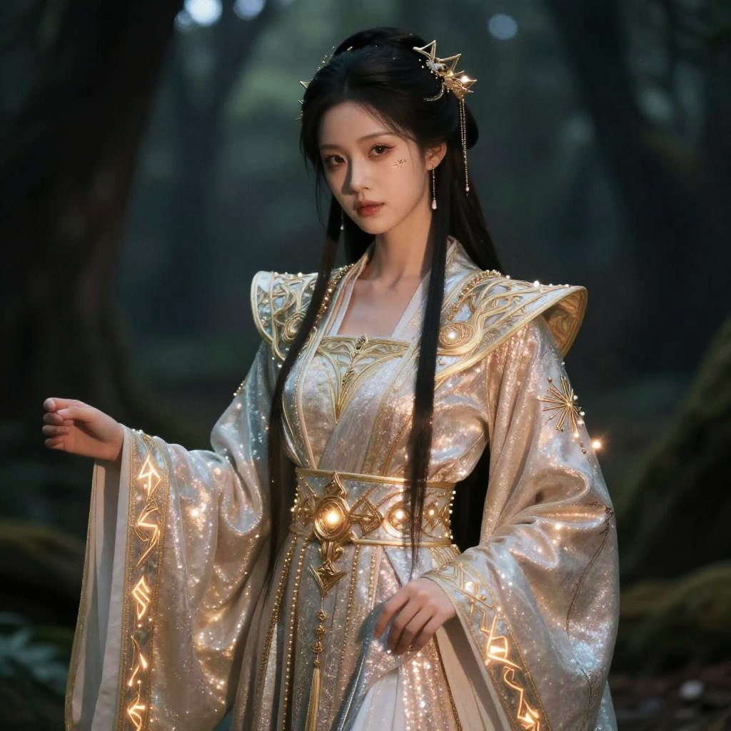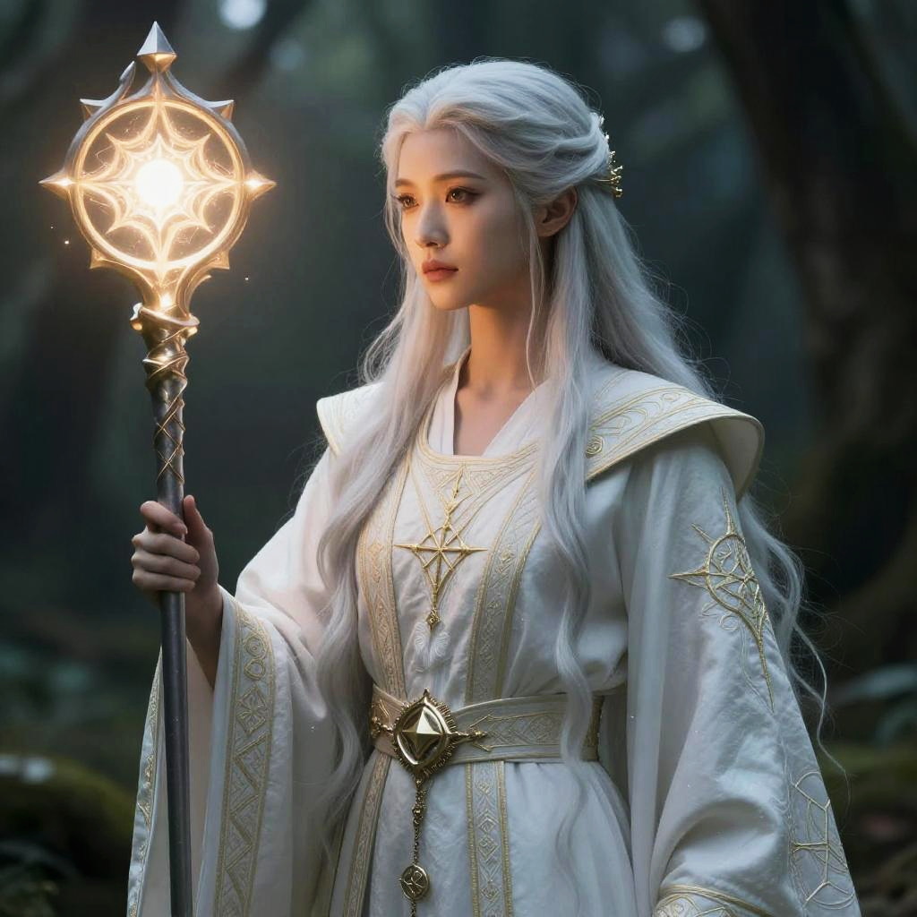 DND AI portrait generator depicting a mystical elven mage, long flowing hair, elegant robes embroidered with arcane symbols, glowing magical staff, ethereal forest background, soft lighting highlighting delicate features, fantasy character portrait