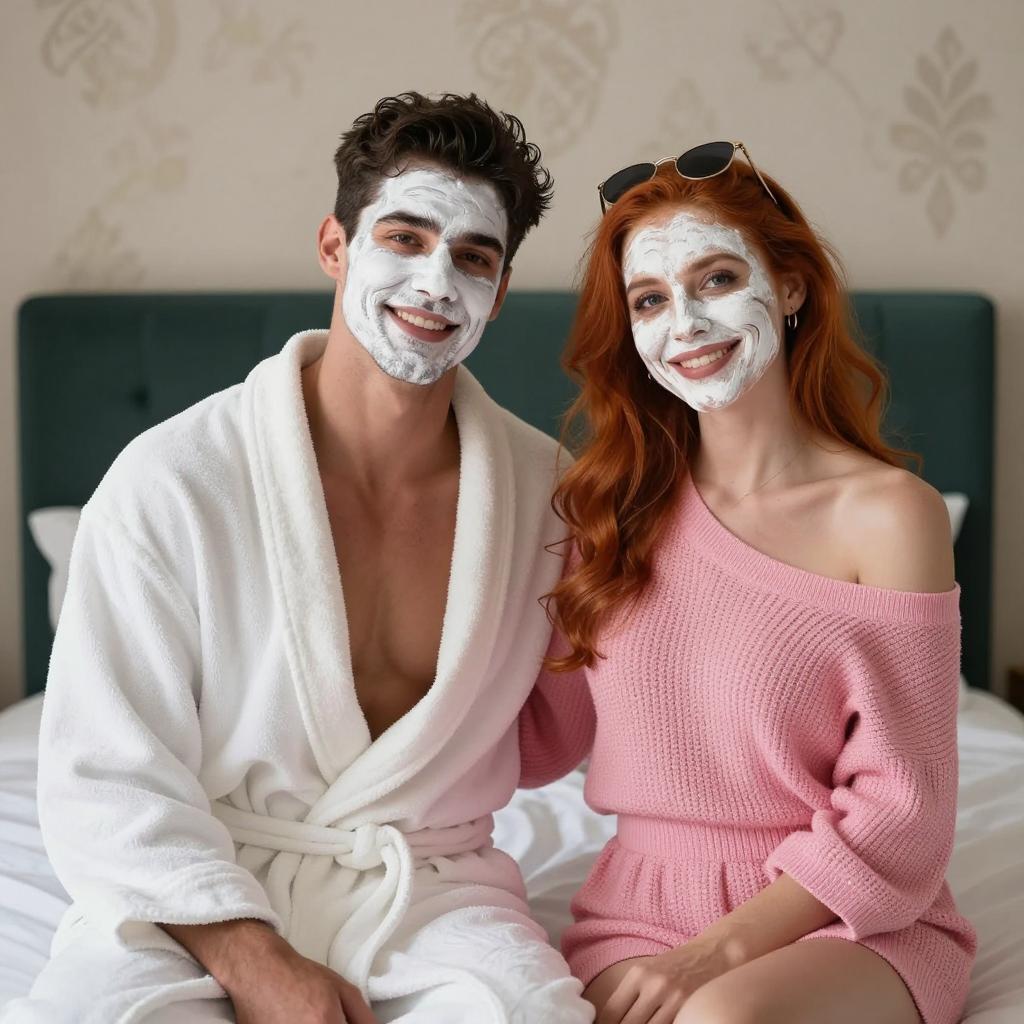 Two people with white face paint sit on a bed. The man on the left has short dark hair, a muscular chest, and a white bathrobe. The woman on the right has red hair, wears a pink off-shoulder knit top, and has sunglasses on her head. Both smile. Background includes a green headboard and patterned wallpaper.