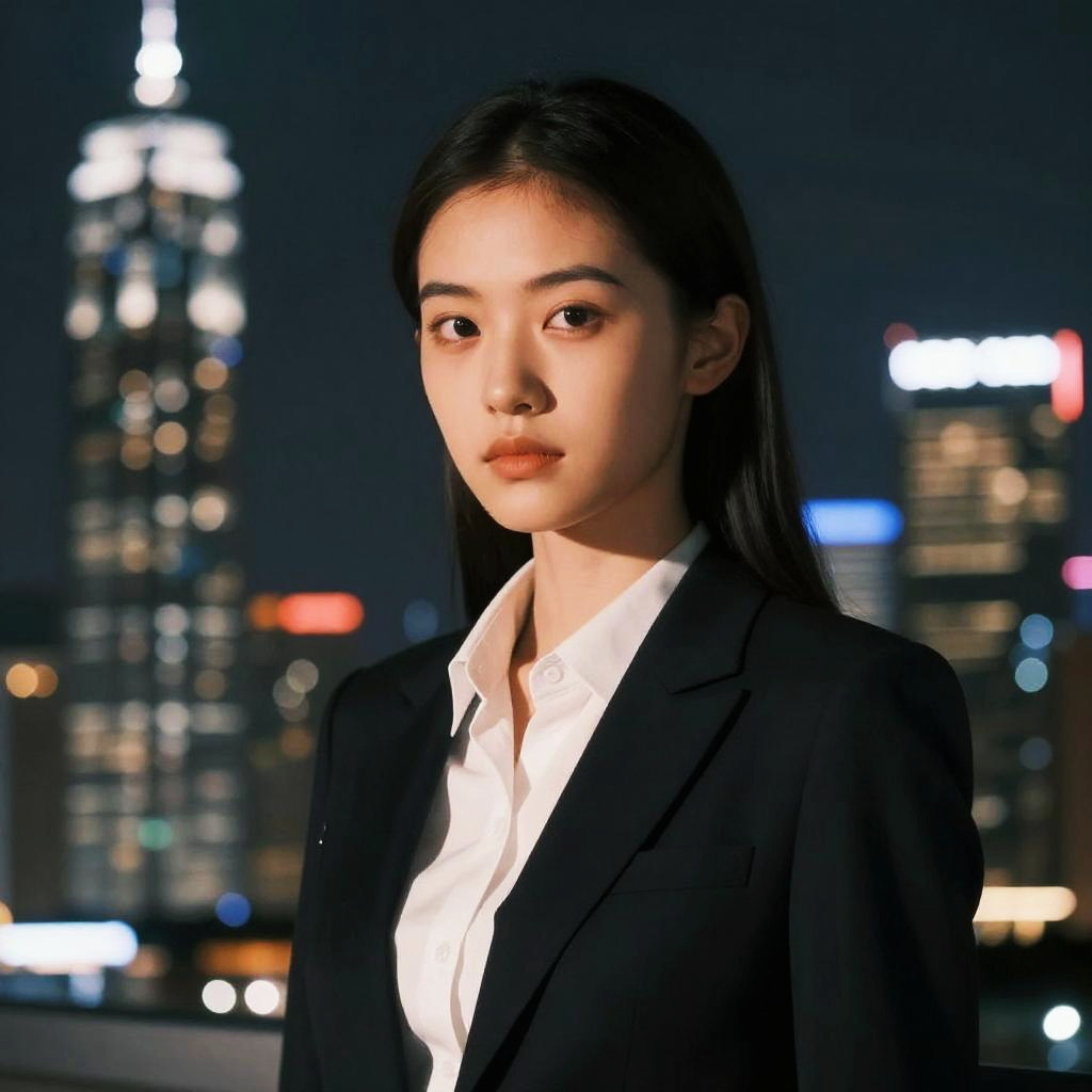 Portrait of a professional Asian female model with 720 waves hairstyle, wearing a futuristic metallic silver jacket and black pants, standing on a modern city rooftop at night. The background features colorful neon lighting and blurred cityscape, creating a fashion editorial atmosphere.