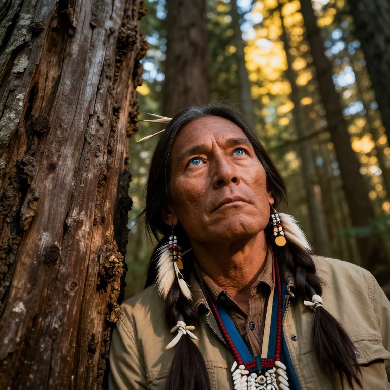 Photograph of an Indigenous man with medium brown skin and long black hair, adorned with white and brown feathers, standing in a forest. He wears a beige shirt, a dark brown vest, and a necklace with white beads. His blue eyes look upward with a contemplative expression. The background features tall, textured tree trunks and blurred sunlight filtering through the forest canopy. The image has a warm, natural light with rich, earthy colors. The man's face is slightly weathered, showing his age and experience.