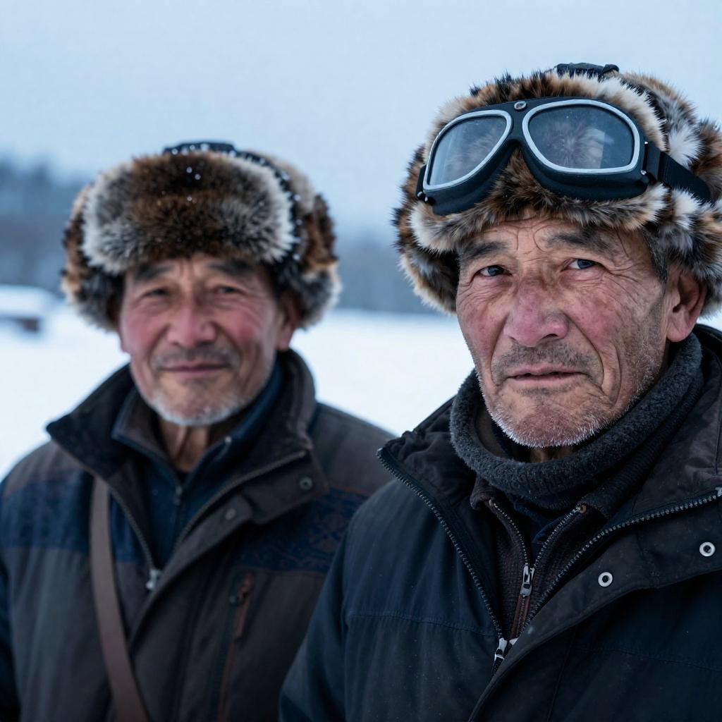 Photograph of two elderly men in winter clothing. Man on right in foreground with intense expression, wearing fur hat with goggles, thick scarf, and dark jacket. Man on left in background with smiling expression, wearing similar fur hat and patterned jacket. Blue snow-covered landscape in background. Both men have rugged, weathered faces.