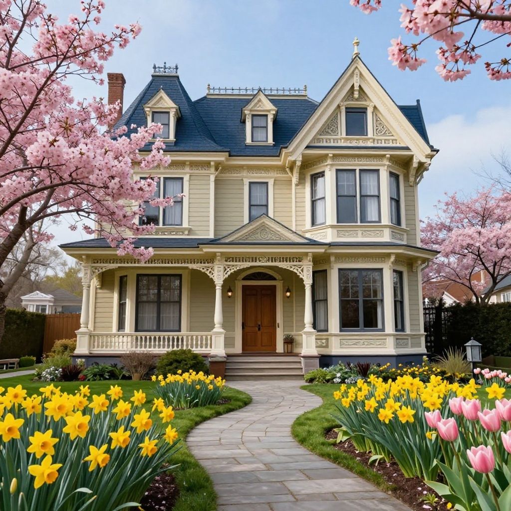 A charming Victorian-style mansion featuring intricate architectural details and a dark blue roof with cream accents. The front yard showcases a lush garden with blooming pink cherry blossoms, vibrant yellow daffodils, and pink tulips. A winding stone pathway leads to the wooden entrance door, creating a warm and inviting springtime atmosphere under a clear blue sky.