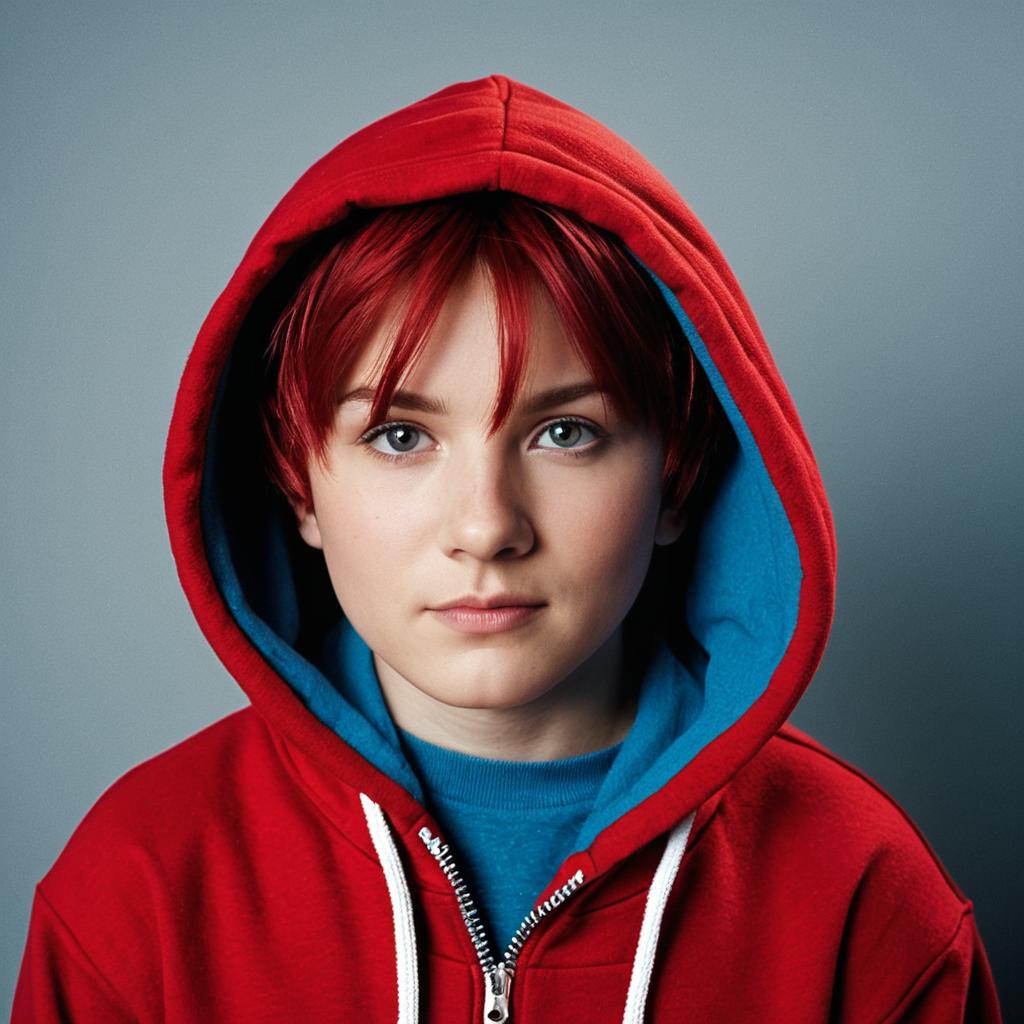 Portrait of a young person with pale skin and red hair wearing a red zip-up hoodie with a blue inner lining and a blue shirt underneath, looking directly at the camera with a neutral expression. The background is plain gray.