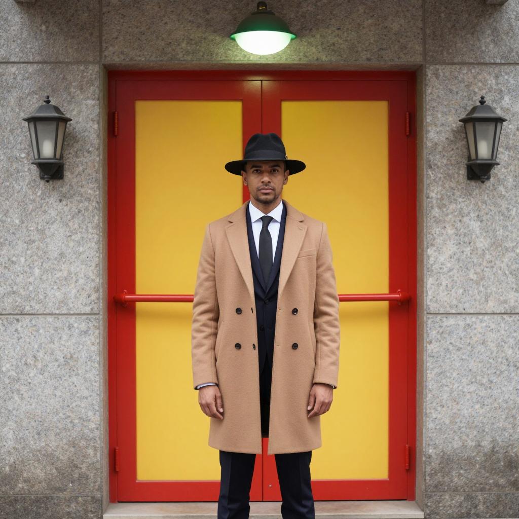 Man in center wearing tan overcoat, dark suit, white shirt, black tie, and fedora hat. Standing in front of a red-framed door with yellow background. Two wall-mounted lamps on either side. Granite walls. Green overhead light above door. Red railing behind door. Man's hands relaxed by sides.