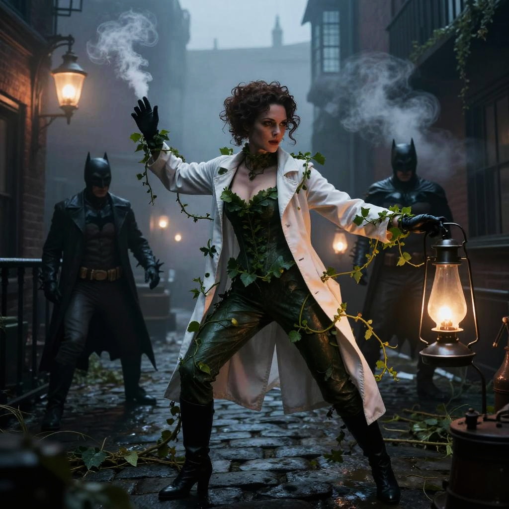 A Poison Ivy reimagined as a Victorian-era biochemist entwined with sentient vines from the Batman universe, set in fog-drenched cobblestone rooftops of Neo-Victorian Gotham lit by gaslamps and drifting steam. Directed by a period-piece auteur, the scene captures intense action with dramatic lighting, creating a cinematic atmosphere filled with deep shadows.
