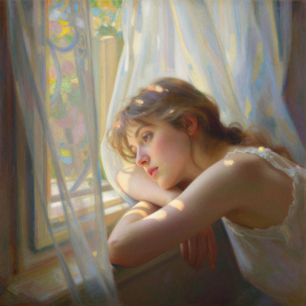 Craft an evocative scene that intertwines the delicate brushstrokes and luminous color palettes of impressionism with the intricate hyperdetails characteristic of contemporary digital art. The setting should feature a young woman in repose near a window where gentle sunlight caresses sheer draperies, casting a soft glow across her features. An overhead viewpoint should emphasize the interplay between light and shadow on her skin and the surrounding environment, while also capturing her subtle expressions. This serene moment should evoke a sense of introspection and tranquility, blending elements of everyday life with an ethereal grace that instills warmth and serenity within the observer.