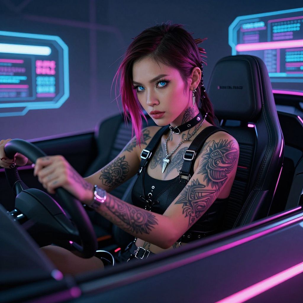 A cyberpunk woman with intricate tattoos and a piercing drives a futuristic car, surrounded by neon lights and holographic displays.