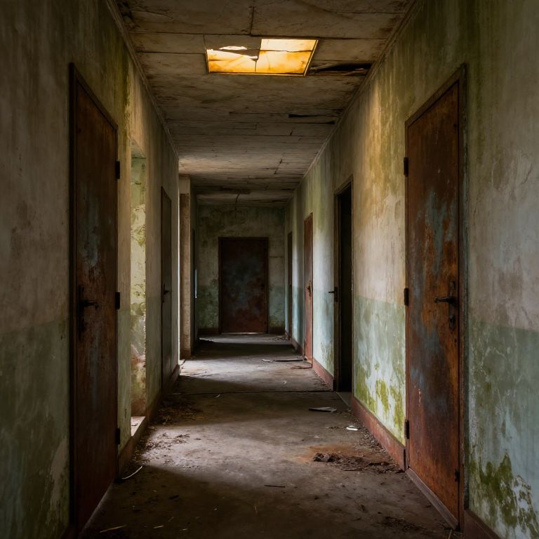 Abandoned liminal space, desolate transitional hallway with rusted metal doors slightly ajar, textured walls covered with grime and moss, faint warm glow filtering through cracked ceiling panels, haunting yet peaceful environment, ultra-detailed