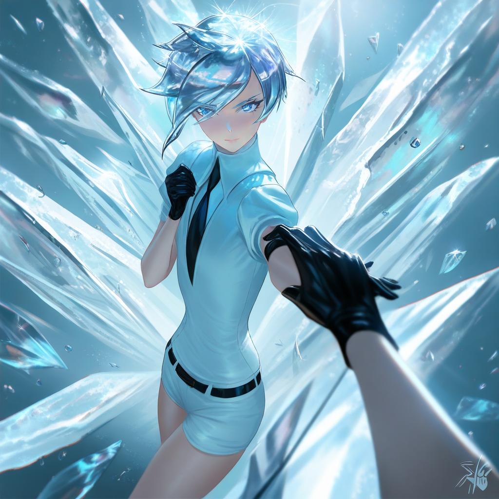 Antarcticite, houseki no kuni, 1other, blue eyes, grey eyes, colored eyelashes, short hair, white hair, crystal hair, gem uniform (houseki no kuni), gem uniform (houseki no kuni), black gloves, necktie, by artist raikoart, animagine