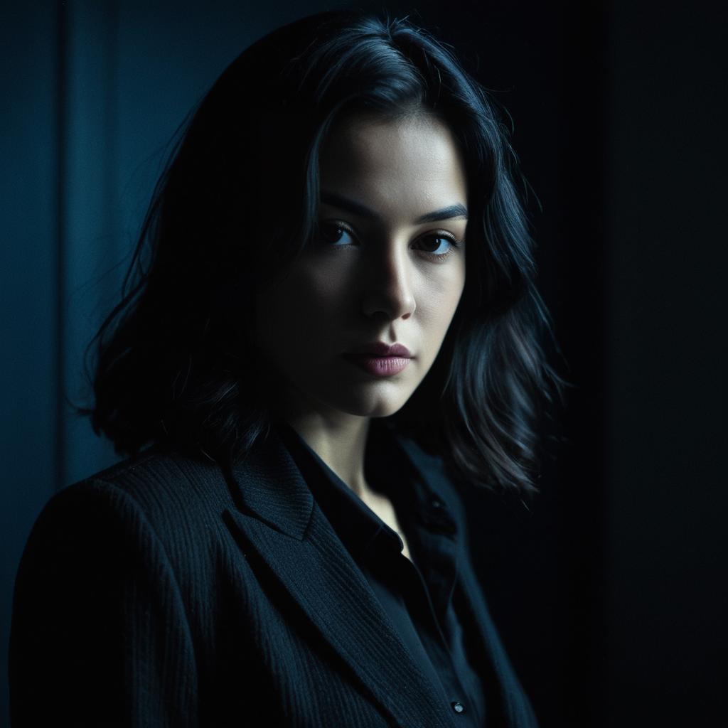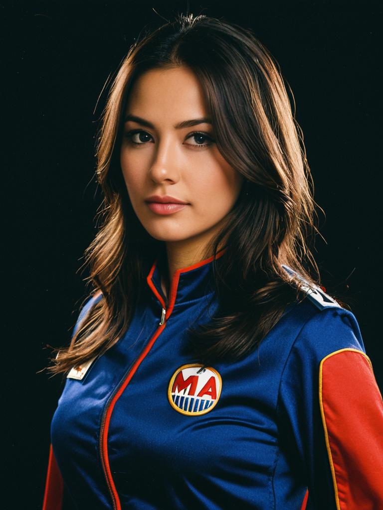 Woman in Mia costume, photorealistic studio headshot, sharp detail