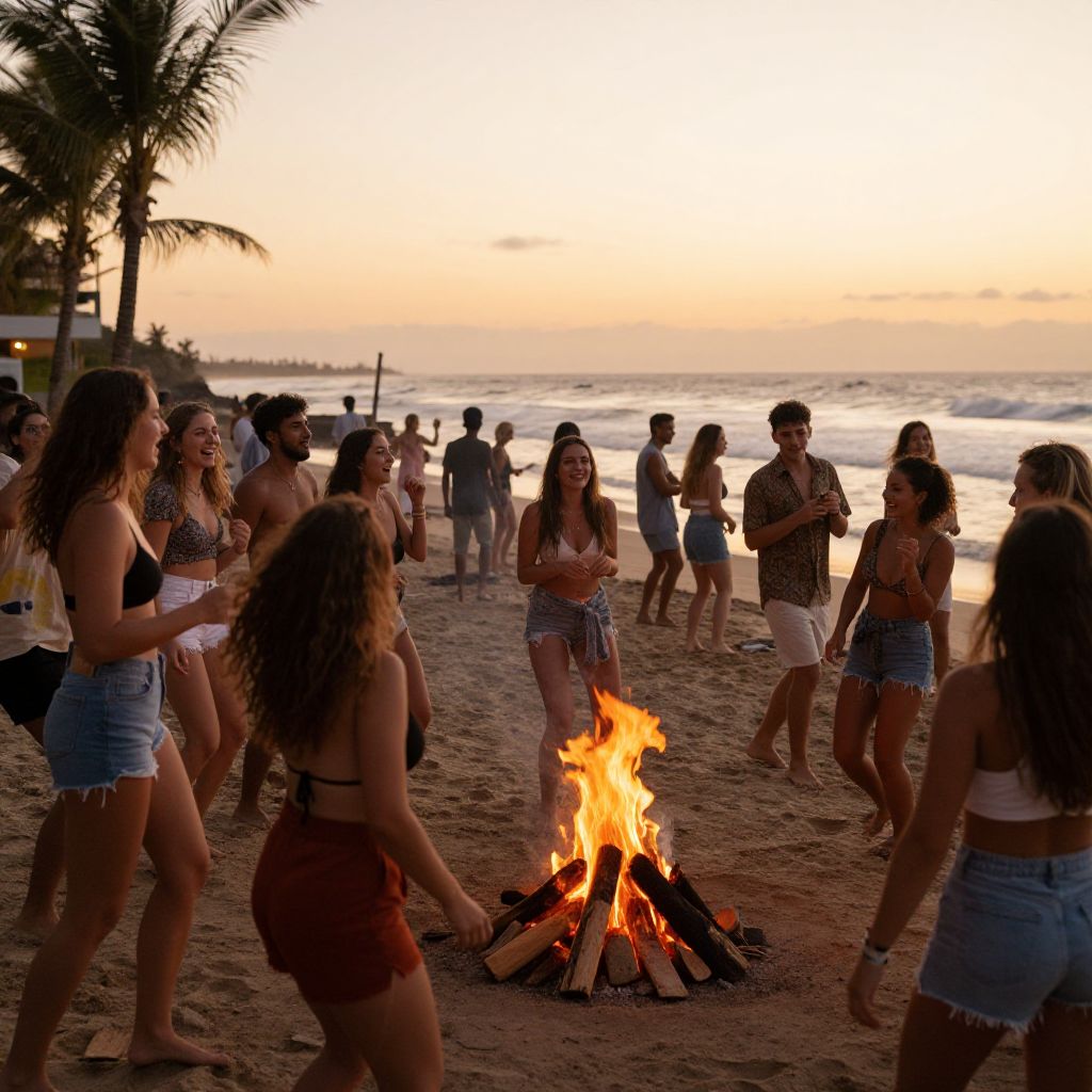 Photograph of a beach at sunset with a group of young adults gathered around a campfire. The scene features both men and women, predominantly wearing casual summer clothing such as shorts and tank tops. The fire is centered in the foreground, with flames brightly illuminating the sandy area. In the background, the ocean waves are visible, and a palm tree is on the left. The sky is painted with warm hues of orange and pink. The people are laughing and chatting, creating a lively and relaxed atmosphere. The image captures the social and festive vibe of a beach gathering.