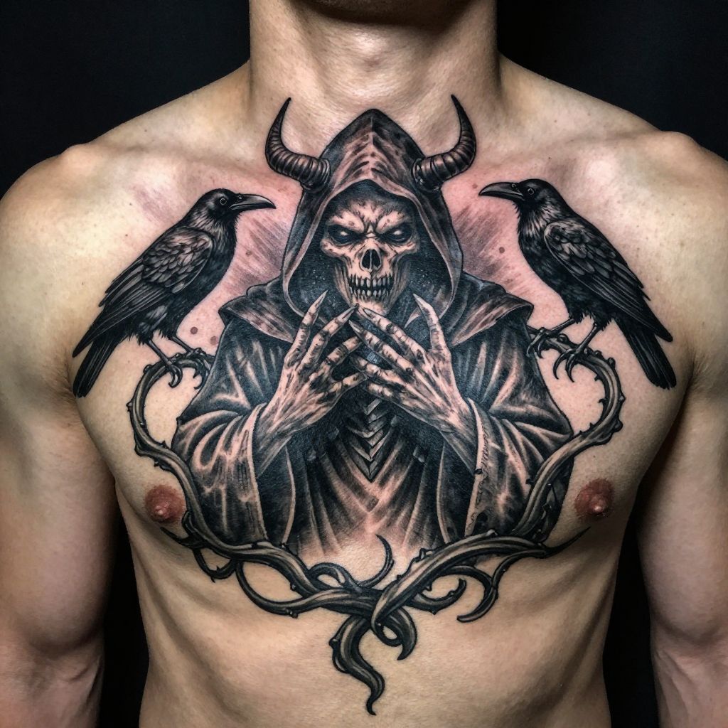 Photograph of a muscular, shirtless man with a large, black and grey tattoo on his chest. The tattoo depicts a grimacing skull with hollow eyes and bared teeth, wearing a hooded cloak with curved horns. Two black ravens with detailed feathers are perched on either side of the skull. The tattoo features intricate shading and line work, with twisted, vine-like patterns at the bottom. The man's skin is pale, and his nipples are visible. The background is dark, highlighting the tattoo's contrast and details.