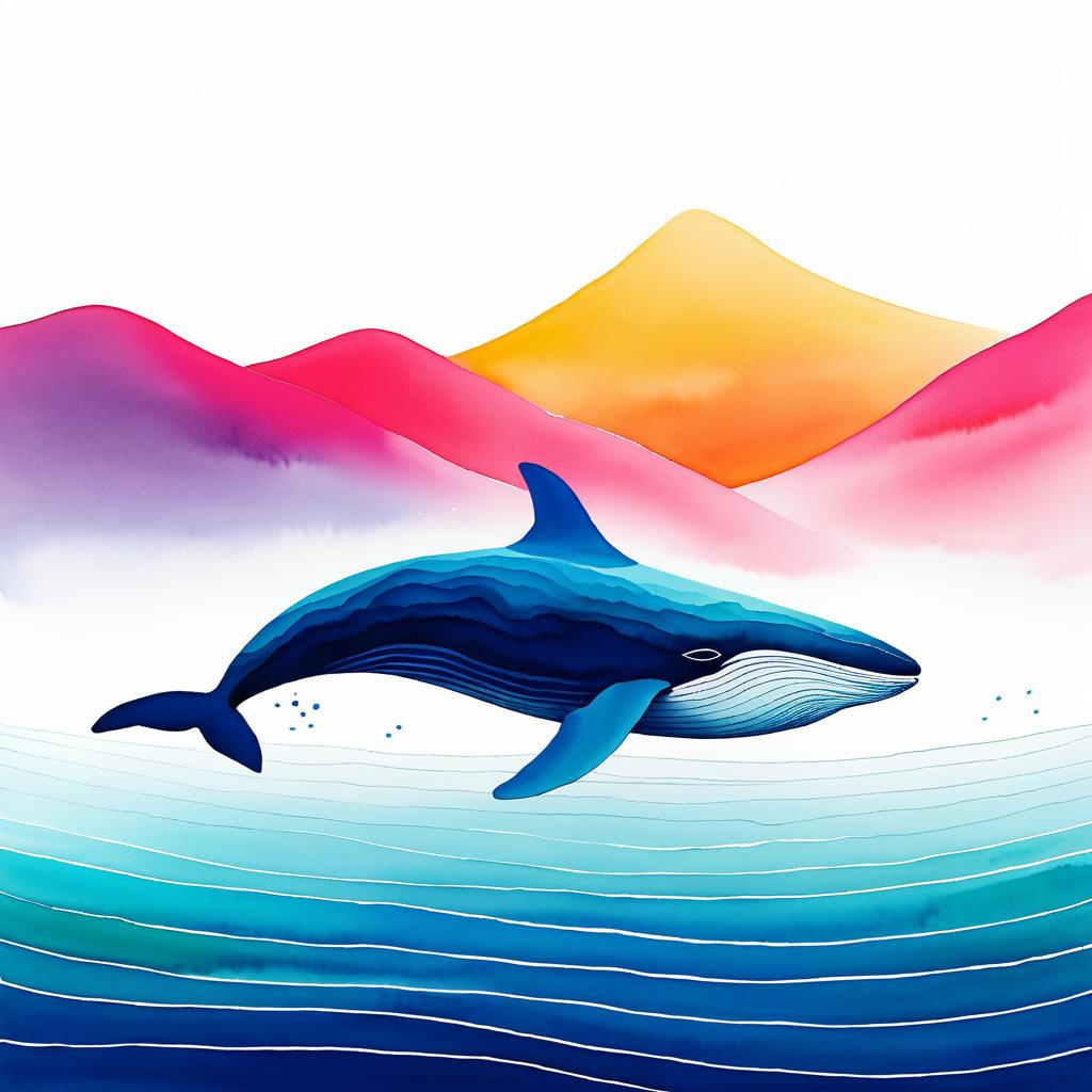 Hand-drawn illustration of a blue whale in a minimalistic style featuring vibrant colors and smooth gradient shading. The whale is set against a white background with abstract, colorful shapes reminiscent of ocean waves or landscapes, emphasizing a clean and modern artistic approach.