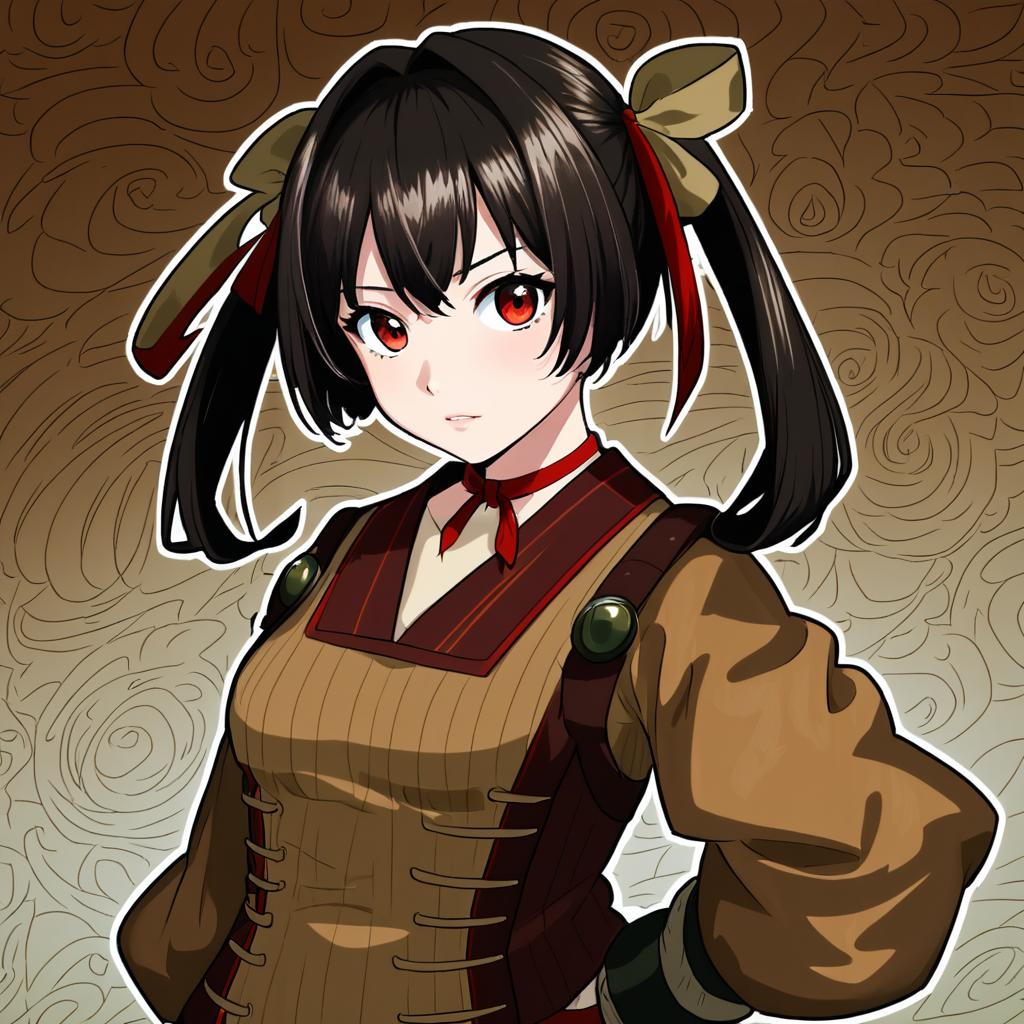 This digital anime-style drawing features a young woman with fair skin and large, expressive red eyes. She has black hair tied into two low pigtails with yellow ribbons. She is wearing a brown, button-up dress with a red ribbon choker, and her sleeves are puffed. The background is a gradient of brown to beige with a swirling pattern. The artist uses bold outlines and a mix of soft and sharp shading to create depth. The character's expression is neutral, and she stands confidently with one hand on her hip.
