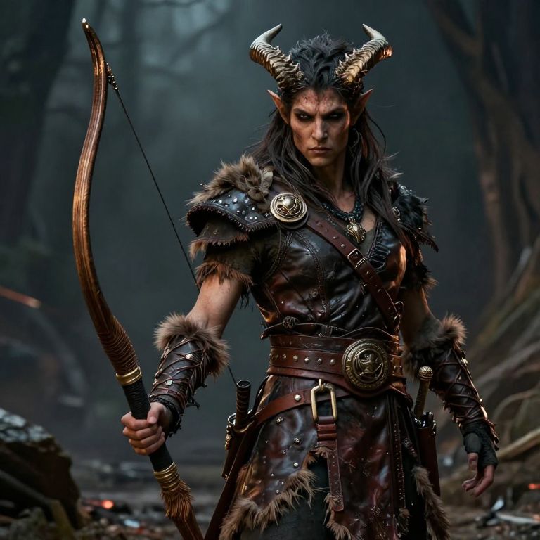 Digital fantasy artwork of a muscular, horned demon archer with dark fur and leather armor, holding a wooden bow in a misty forest. Int