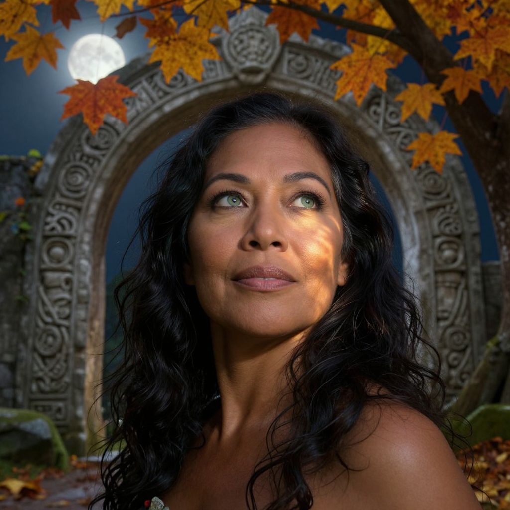 Photograph of a smiling Indian woman with long black hair, glowing green eyes, and warm moonlight, framed by autumn leaves and an ancient stone arch