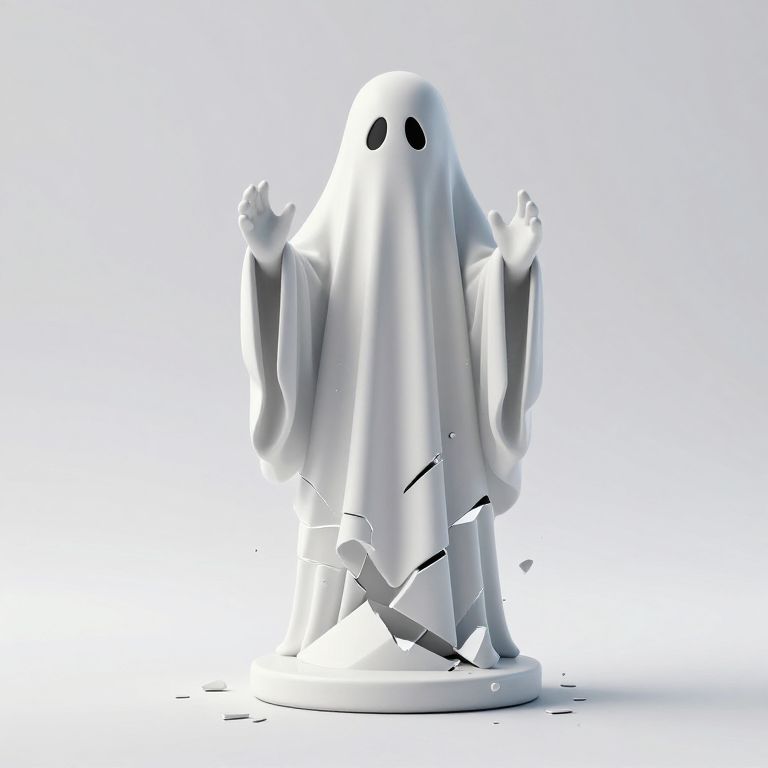 Ghosts White porcelain statue shattered in white studio, seamless background, cinema 4d style rendering, professional lighting, medium format camera, normal lens,
