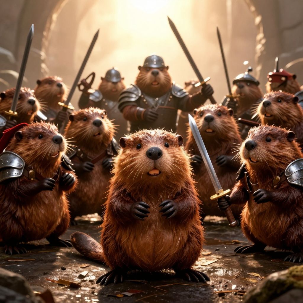 Photograph-style CGI image depicting a group of beavers, each with fluffy, brown fur and small black eyes, standing on a wet, rocky surface. The beavers are holding shiny steel swords in their small paws, looking determined. In the background, five armored soldiers with helmets and shields are standing, also holding swords. The sunlight from behind creates a dramatic, glowing effect, highlighting the contrast between the beavers and the soldiers. The scene has a surreal, humorous tone due to the unexpected combination of cute beavers and fierce warriors.