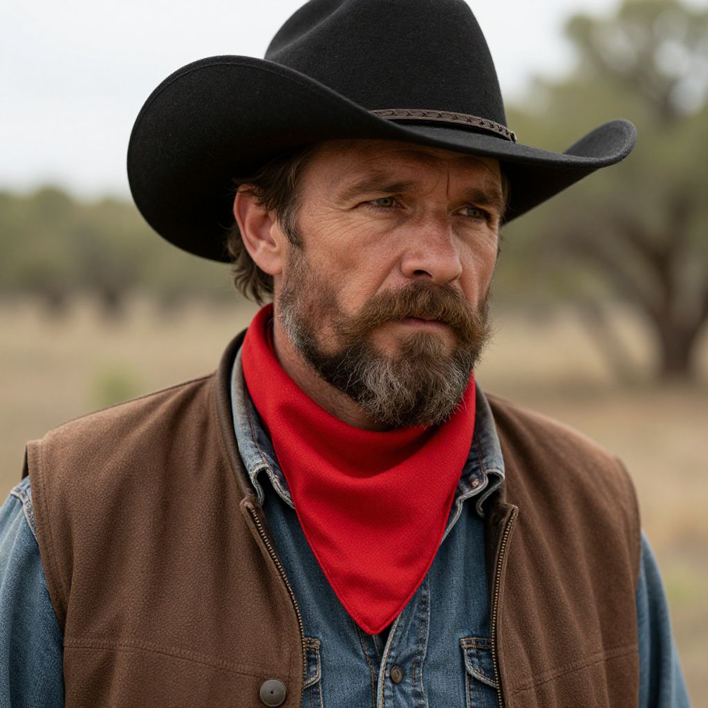 Photograph of a middle-aged man with a rugged appearance, wearing a black cowboy hat, brown vest, blue denim shirt, and a bright red bandana. He has a full, dark beard and mustache, and his expression is serious and contemplative. The background is blurred, featuring an outdoor, grassy landscape with trees, suggesting a countryside setting. The man's attire and facial hair give him a classic cowboy look, while the vivid red bandana adds a pop of color to his ensemble. The image is sharply focused on the man's face and upper torso.