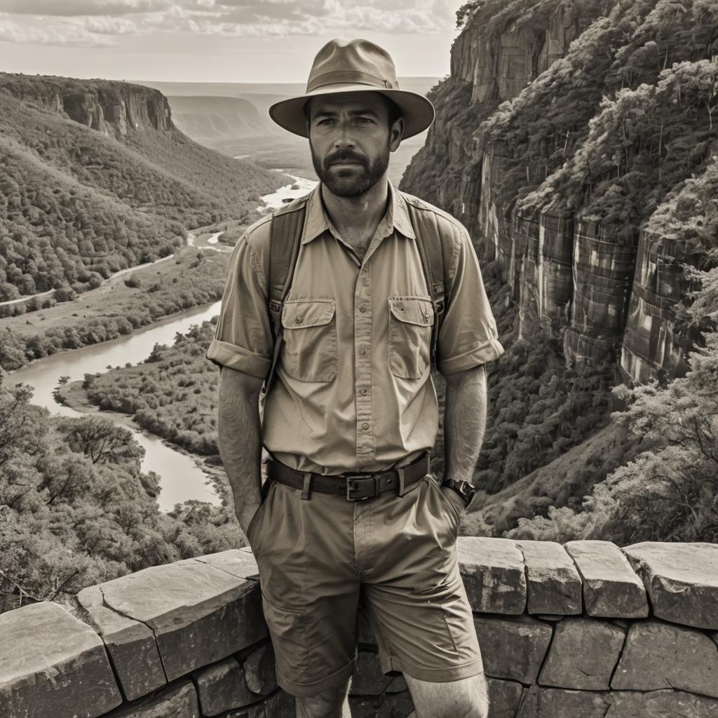 Photo of a Stocky man, Side Part, safari outfit, khaki short-sleeve in Mustard Yellow, cargo shorts in Jute, wide-brim hat, leather boots, utility belt, adventure-ready, scenic overlook, greyscale pensee