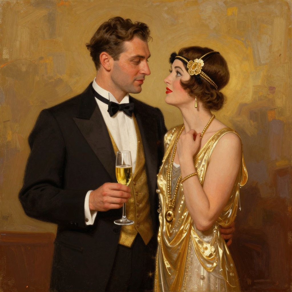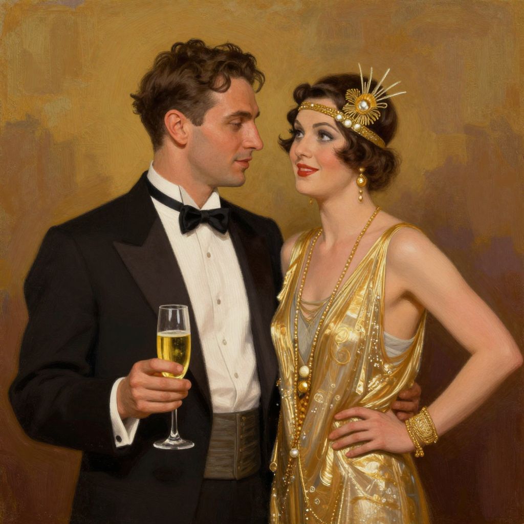 A vintage-inspired digital painting capturing the essence of the Roaring Twenties, featuring a stylishly dressed couple in formal attire, with the man holding a glass of champagne and the woman adorned in an elegant gold dress and headpiece, set against a warm, textured backdrop reminiscent of classic artistry.