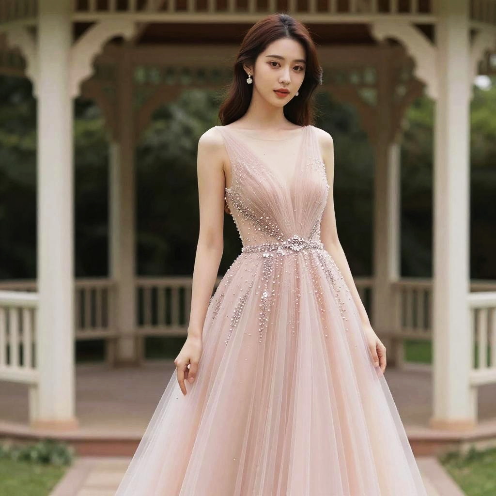 A woman in a romantic glamour style, wearing a blush pink strapless ball gown with a fitted bodice and full voluminous skirt, stands gracefully in a flower shop in a luxury hotel lobby, surrounded by vibrant blooms. Her hair is styled in loose waves, and she wears minimal jewelry with stud earrings, exuding elegance amidst the floral backdrop. Sexy. Pretty face and beutiful eyes