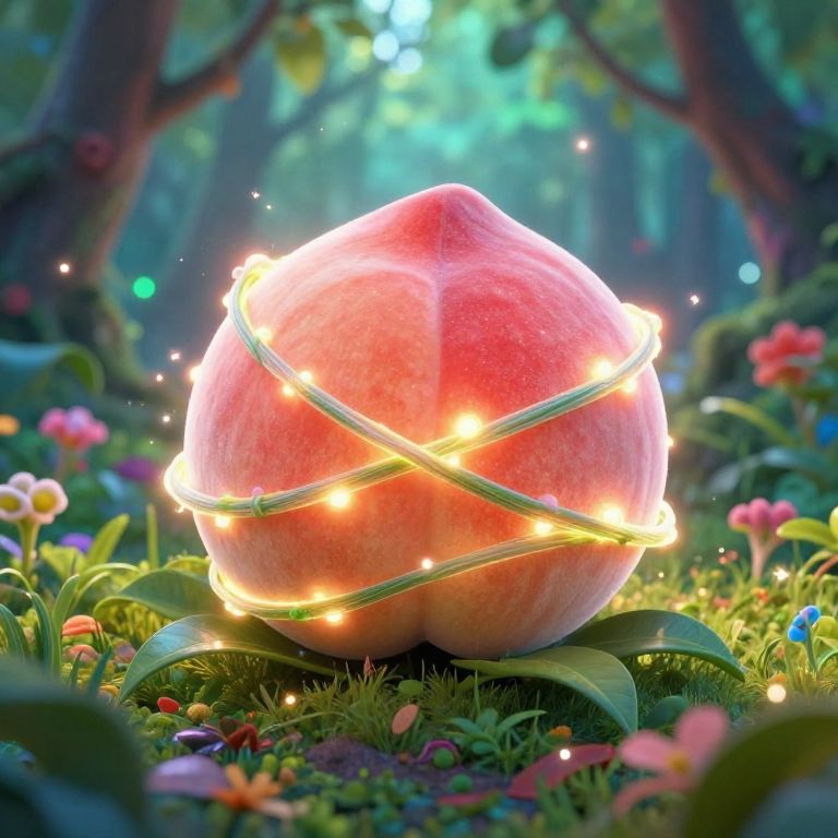 A fantastical scene of a peach tied up with glowing, ethereal vines in an enchanted forest, surrounded by sparkling particles and mystical flora, with vibrant colors and a magical, otherworldly ambiance.