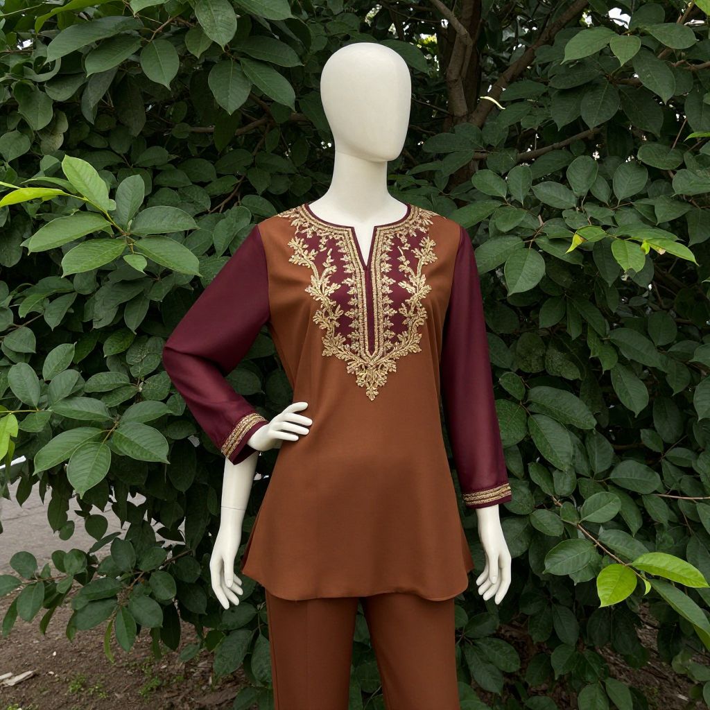 A mannequin wearing a brown and maroon outfit with gold embroidery on the top and brown pants, standing in front of a tree with green leaves. The mannequin has a confident pose, with detailed craftsmanship and a realistic texture. The tree is fully leafed, creating a natural and vibrant environment. The overall scene is serene and stylish, with a focus on the mannequin's elegant design and the lush greenery around it.