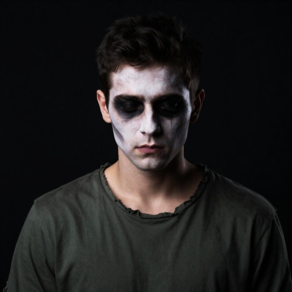 Photograph of a pale, young man with dark, smudged makeup, cracked white face paint, and black eye shadow. He has short, dark hair, wears a rough, dark green shirt, and looks down with a somber expression. Black background.