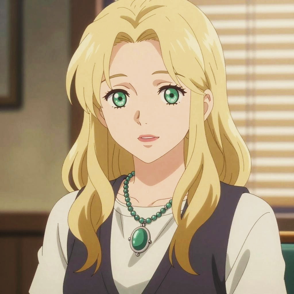This digital anime-style drawing features a blonde woman with long, wavy hair and bright green eyes. She wears a white shirt under a dark purple vest, complemented by a green gemstone necklace with a matching pendant. The background shows blurred, beige-toned blinds and wooden paneling, suggesting an indoor office or study setting. Her expression is calm and slightly smiling. The artwork uses vibrant colors and smooth shading, typical of modern anime illustrations.