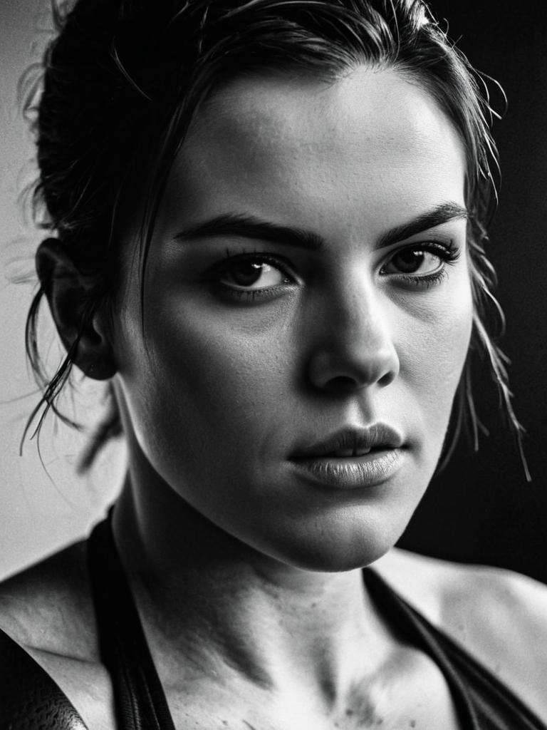 Woman in Female Boxer Costume, close-up detailed headshot with sweat and determination