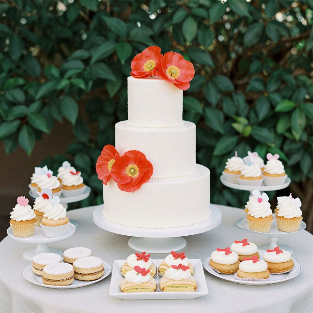 Elegant cake table showcases a three-tiered white wedding cake adorned with vibrant red poppies by Poppies & Posies, surrounded by an array of beautifully presented desserts including cupcakes, cookies, and pastries, all elegantly decorated and set against a backdrop of lush greenery, captured by Jen Huang Photography for Southern Weddings Magazine.