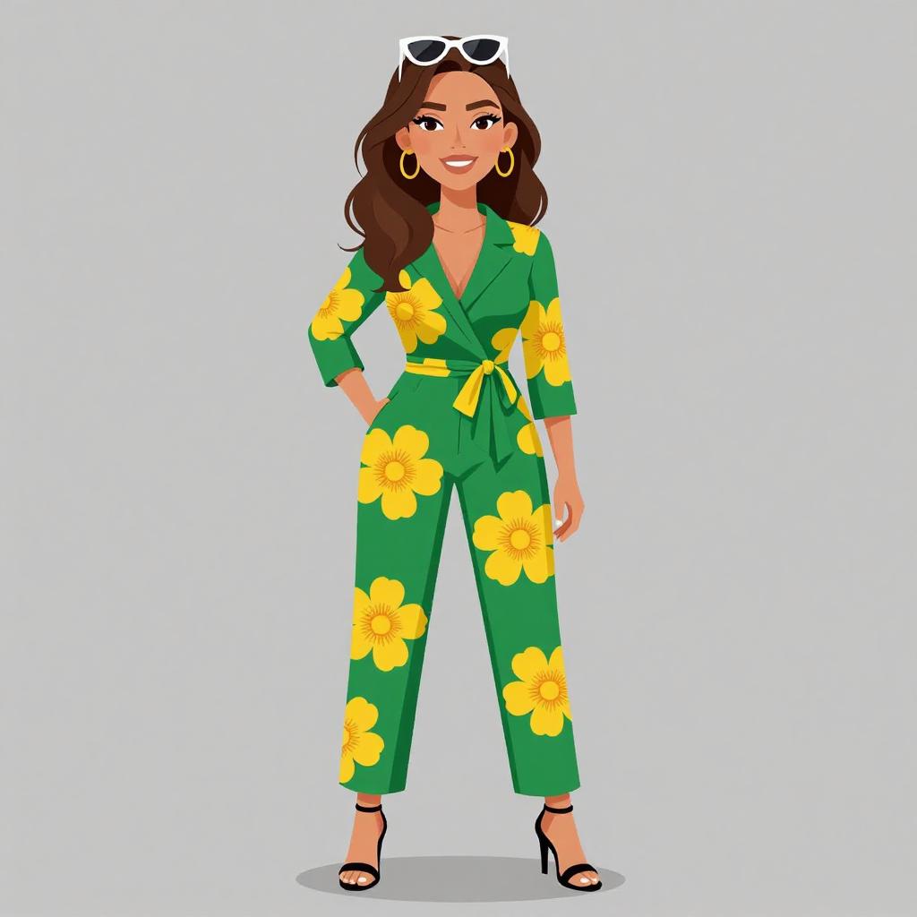 Woman with pretty face and pretty hair. smiling Woman, bold print, tailored jumpsuit in forest green with large yellow floral patterns, three-quarter sleeves, wrap front with V-neck, tie waist, straight-leg pants, ankle length, white cat-eye sunglasses resting on head, strappy heeled sandals in a nude tone, gray studio background. --sref 1467