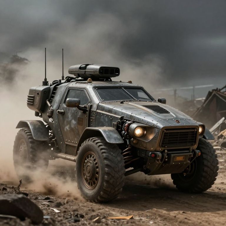 Dieselpunk style armored vehicle racing through a post-apocalyptic wasteland, thick smoke, metal rivets, bulky mechanical design, dusty environment, dark and moody lighting
